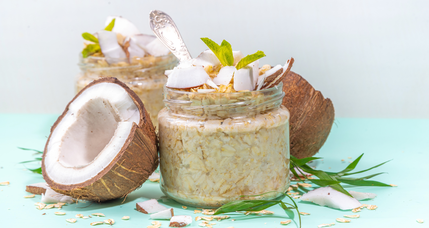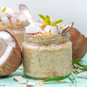 In questa versione al cocco e cioccolato fondente, uniamo la dolcezza tropicale del cocco alla golosità del cioccolato, con la cremosità dei fiocchi d’avena ammorbiditi tutta la notte. È un piatto ricco di fibre, con un ottimo bilanciamento di carboidrati a lento rilascio, grassi buoni e – se aggiungi le proteine in polvere – anche un ottimo apporto proteico.